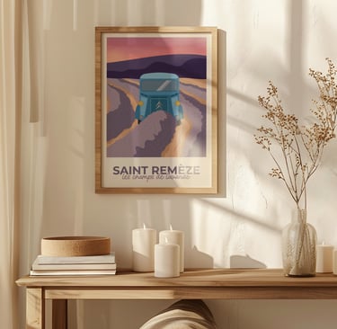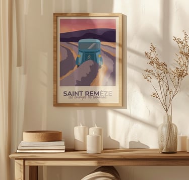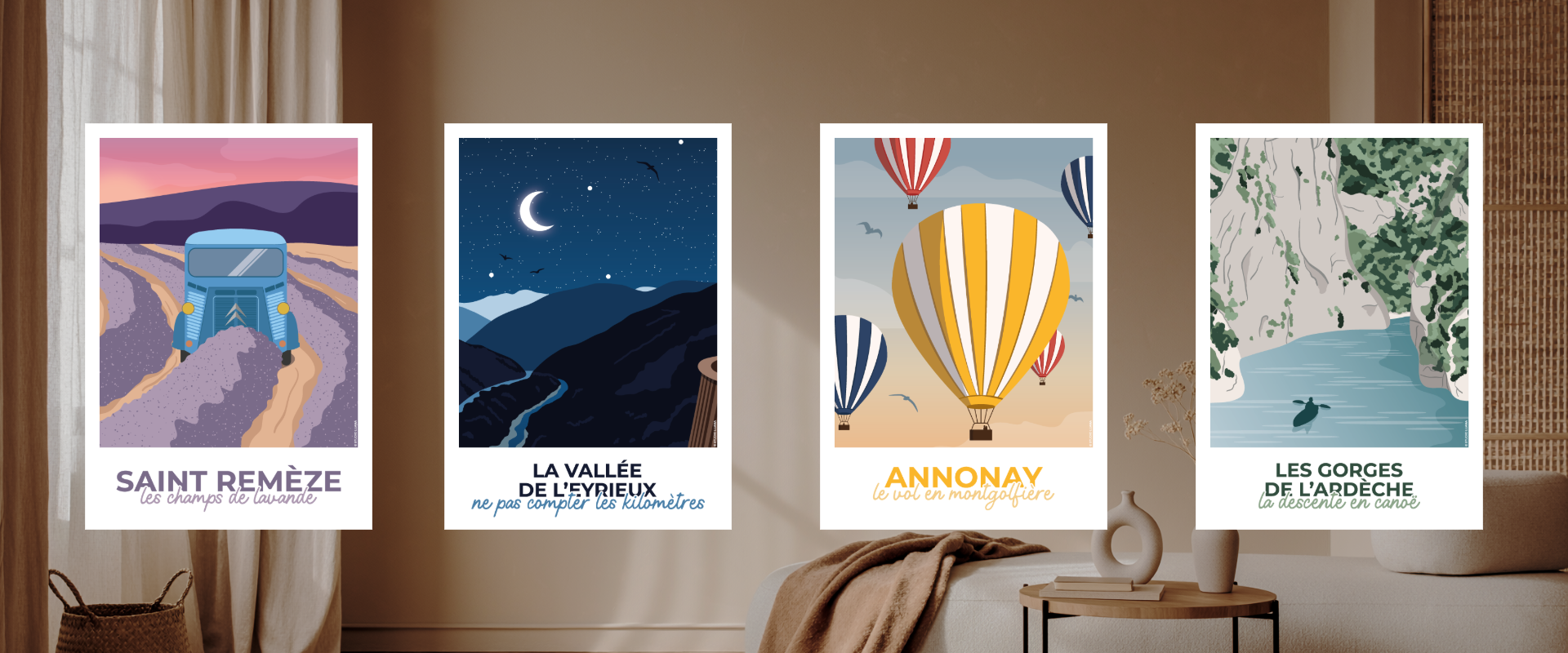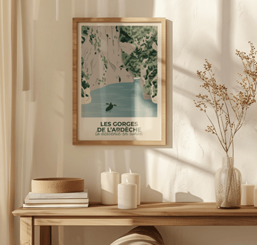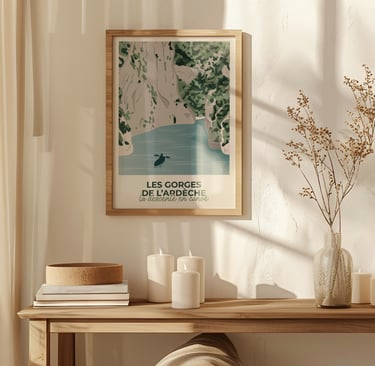 Accrochées au mur, ces illustrations apportent une touche de voyage et d’évasion, comme un souffle d’air ardéchois à l’intérieur de chez soi. Elles célèbrent le local, les racines, et cette relation presque intime que l’on peut entretenir avec un lieu qui nous ressemble.